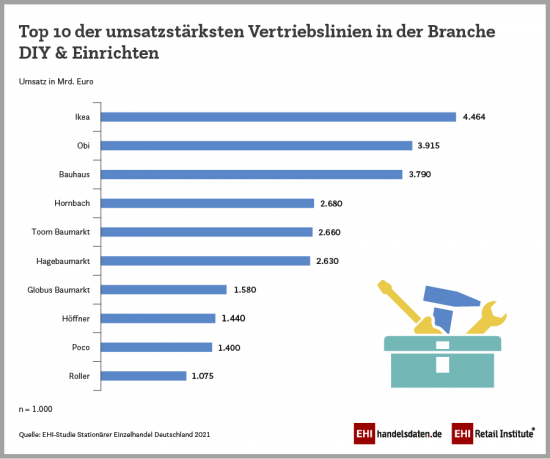 Die Top 1.000 stationären Vertriebslinien erwirtschafteten 2020 einen Netto-Umsatz von über 300 Mrd. Euro, das sind fast 60 Prozent des gesamten Einzelhandelsumsatzes (577,4 Mrd. Euro) in Deutschland. Ein Gewinner ist dabei die DIY-Branche, wie die EHI-Analyse „Stationärer Einzelhandel 2021“ zeigt. Der Bereich Baumarkt ist durch 17 Vertriebslinien in dem Top-1.000-Ranking vertreten. Diese erwirtschafteten über 40 Prozent der Erlöse des 2020 stark gewachsenen DIY-Marktes. Die laut Branchenverband überdurchschnittliche Steigerungsrate von 14 Prozent sei auf die frühen Lockdown-Lockerungen für die Bau- und Gartenmärkte zurückzuführen, unterstreicht das EHI. Außerdem habe der Cocooning-Trend die Menschen motiviert, es sich in den eigenen vier Wänden gemütlich zu machen. Unter den Top 1.000 befinden sich 176 Filialisten aus der Branche DIY & Einrichten, diese betreiben insgesamt 9.400 Verkaufsstellen und erwirtschaften 15,7 Prozent des gesamten Einzelhandelsumsatzes der Top 1.000.