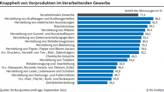 „Es sind viele Aufträge da, Unternehmen können diese gegenwärtig aber nicht produzieren“, ergänzt Wohlrabe. Bei elektrischen Ausrüstungen (93 Prozent), in der chemischen Industrie (67 Prozent) und dem Maschinenbau (89 Prozent) wird von Problemen berichtet. In der Papierindustrie meldeten ebenfalls deutlich mehr Unternehmen Knappheit auf der Beschaffungsseite (79 Prozent nach 61 Prozent). Eine Entspannung der Lage gab es in keiner Branche.