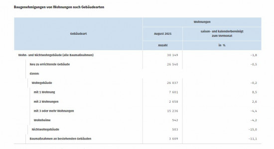 Die Zahl der Baugenehmigungen von Wohnungen in neuen Ein- und Zweifamilienhäusern in Deutschland stieg im August 2021 nach vorläufigen Angaben des Statistischen Bundesamts (Destatis) gegenüber dem Vormonat saison- und kalenderbereinigt um 8,5 und 2,6 Prozent. Einen Rückgang um 4,4 Prozent gab es bei den Wohnungen in neuen Mehrfamilienhäusern. Die Genehmigungen für Wohnungen, die durch Baumaßnahmen an bestehenden Gebäuden entstehen, haben sich um 11,1 Prozent verringert. Insgesamt wurde im August 2021 der Bau von insgesamt 30.149 Wohnungen bewilligt. Das waren laut Destatis saison- und kalenderbereinigt 1,8 Prozent weniger als im Juli 2021.
