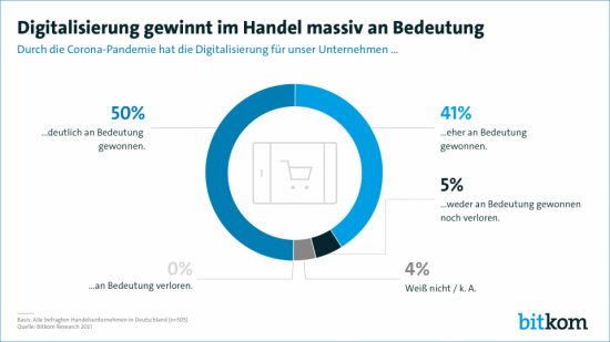 Der Handel in Deutschland ist seit Corona so digital wie nie. Das zeigt eine aktuelle Befragung des Digitalverbands Bitkom unter mehr als 500 Groß- und Einzelhändlern in Deutschland. Demnach sind 72 Prozent auf sozialen Medien aktiv – vor zwei Jahren waren es noch 28 Prozent. 8 Prozent kooperieren mit Influencern, 2019 war es noch weniger als 1 Prozent. Eine eigene Website gehört für 98 Prozent zum Standard. 85 Prozent der Befragten verkaufen ihre Waren komplett oder parallel zu einem stationären Geschäft im Internet. 2019 waren es 58 Prozent. Von jenen, die online verkaufen, bieten 72 Prozent ihre Produkte und Dienstleistungen auf Online-Marktplätzen oder -Verkaufsplattformen an. Vor zwei Jahren waren es 46 Prozent.