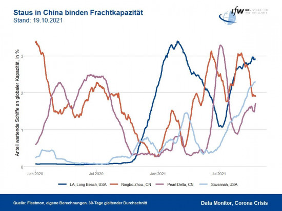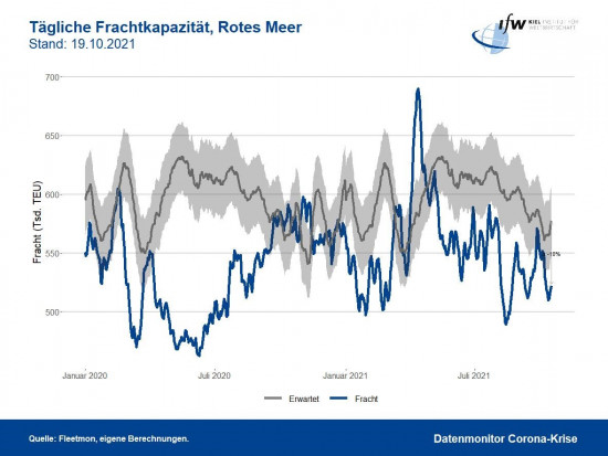 Während der Stau vor dem chinesischen Hafen Ningbo-Zhoushan langsam nachlässt, hat sich der Andrang von Containerschiffen im Perlflussdelta verschärft. In den USA stecken vor Los Angeles und Long Beach fast drei Prozent der weltweiten Frachtkapazität fest, vor Savannah über zwei Prozent. Weltweit sind rund 9 Prozent der Frachtkapazität durch Containerstaus gebunden, auch durch leere Containerschiffe, die auf Beladung warten. Über 3 Prozent aller verschifften Waren auf dem Seeweg stecken in wartenden Schiffen fest. Das Frachtvolumen im Roten Meer – der wichtigsten See-Handelsroute zwischen China und Europa – liegt gegenwärtig etwa 10 Prozent niedriger, als unter normalen Umständen zu erwarten wäre, berichtet das Institut.