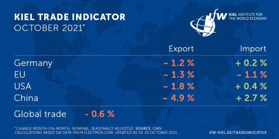 Der Welthandel steht weiter im Bann gravierender Containerstaus und eine Entspannung zeichnet sich nicht ab, wie die Auswertung des Kiel Trade Indicators 10/2021 des Institutes für Weltwirtschaft zeigt. Chinas Handel verharrt auf dem Niveau vom Frühjahr. Der Kiel Trade Indicator signalisiert für die Exporte im Oktober 2021 nominal und saisonbereinigt ein Minus von 4,9 Prozent im Vergleich zum Vormonat und für die Importe ein Plus von 2,7 Prozent. Der Handel den USA ist seit dem Frühjahr leicht rückläufig. Für die Exporte im Oktober wird ein Minus von 1,8 Prozent ausgewiesen, für die Importe ein Plus von 0,4 Prozent. Deutschlands Importe brachen in diesem Sommer deutlich ein und konnten sich seitdem noch nicht wieder erholen, hier zeigt der Indicator ein Plus von 0,2 Prozent im Oktober. Für die Exporte ist ein Minus von 1,2 Prozent zu erwarten. Für die EU wird von einem Rückgang bei Exporten um 1,3 Prozent und bei Importen um 1,1 Prozent ausgegangen. Der Welthandel dürfte laut den Wirtschaftsexperten im Oktober leicht um 0,6 Prozent zurückgehen.