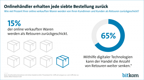Nach Einschätzung der Betreiber von Onlineshops werden 15 Prozent der im Internet bestellten Waren zurückgeschickt. Das zeigt eine Befragung im Auftrag des Digitalverbands Bitkom unter mehr als 500 Handelsunternehmen in Deutschland, darunter 203 Einzelhändler, die teilweise oder ausschließlich im Internet verkaufen. Bei 44 Prozent der Befragten belasten Rücksendungen das Geschäft. 51 Prozent berichten von steigenden Kosten durch Rückgaben.