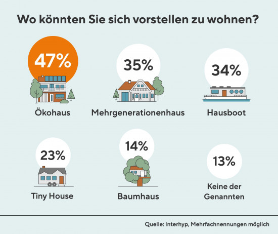 In Baumhäuser würden heute 14 Prozent der Befragten ziehen, vor zwei Jahren waren es elf Prozent. Fünf Prozent mehr Deutsche als im Jahr 2019, und damit 34 Prozent, können sich vorstellen, in einem Hausboot zu wohnen. Dass Häuser ökologischen Standards entsprechen müssen, befürworten 47 Prozent der Umfrageteilnehmer, 2019 waren es 43 Prozent.