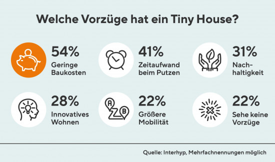 54 Prozent der Befragten verbinden geringe Baukosten und sparsames Wohnen mit der neuen Wohnform. Weniger Zeitaufwand für Putzen und Aufräumen attestieren 41 Prozent dem kleinen Haus, 31 Prozent schätzen das nachhaltige Wohnen, 28 Prozent die innovative Wohnform und 22 Prozent die Mobilität.