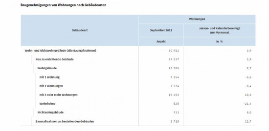 Im September 2021 fiel die Zahl der Baugenehmigungen von Wohnungen in neuen Ein- und Zweifamilienhäusern nach vorläufigen Angaben des Statistischen Bundesamts (Destatis) gegenüber dem Vormonat saison- und kalenderbereinigt um 6,6 und 8,4 Prozent. Bei den Wohnungen in neuen Mehrfamilienhäusern wurde ein Anstieg um 10,3 Prozent verzeichnet. Die Zahl der Genehmigungen für Wohnungen, die durch Baumaßnahmen an bestehenden Gebäuden entstehen, hat sich um 12,7 Prozent erhöht. Insgesamt wurde im September dieses Jahres der Bau von 30.952 Wohnungen genehmigt. Das waren saison- und kalenderbereinigt 3,9 Prozent mehr als im August 2021.