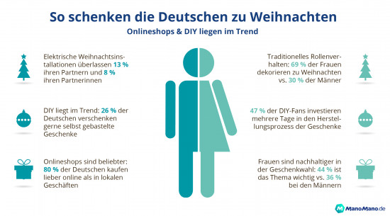 DIY zu Weihnachten liegt im Trend. Diese Erkenntnis zieht der Online-Marktplatz ManoMano aus einer von ihm beauftragten YouGov-Umfrage im November. Mehr als ein Viertel der befragten Deutschen (26 Prozent) haben angegeben, ihre Weihnachtsgeschenke selbst herzustellen. Mit 34 Prozent waren es etwa doppelt so viele Frauen wie Männer. Die größte Gruppe davon ist über 55 Jahre alt (37 Prozent), gefolgt von den 25- bis 34-Jährigen (21 Prozent). Dabei investieren fast die Hälfte der DIY-Fans mehrere Tage (47 Prozent) in den Herstellungsprozess. Auch hier liegen die Frauen mit knapp 49 Prozent vorne. Bei anspruchsvollen Projekten, die länger als eine Woche Arbeit benötigen, wird der Gender-Gap besonders deutlich: 19 Prozent der Befragten sind weiblich, wohingegen 6 Prozent männlich sind.