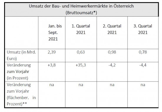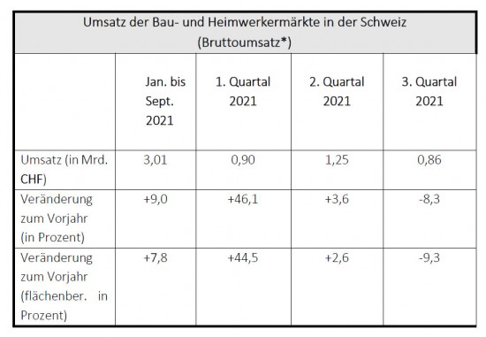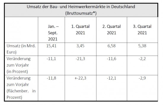 Der Gesamtumsatz der deutschen Bau- und Gartenfachmärkte lag in den ersten neun Monaten 2021 laut dem Branchenverband BHB bei einem Minus von 11,1 Prozent (bereinigt -11,8 Prozent) unter dem Vorjahreszeitraum. Einfluss auf diese Zahlen hätten unter anderem schlechtes Wetter, der Lockdown, Preisanstiege und Materialengpässe gehabt. In Österreich legte die Branche im Neun-Monats-Vergleich um 3,8 Prozent zu. In der Schweiz wuchs der Umsatz um 9 Prozent (bereinigt 7,8 Prozent).