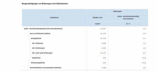 Im Oktober 2021 stieg laut dem Statistischen Bundesamt (Destatis) die Zahl der Baugenehmigungen von Wohnungen in neuen Ein- und Zweifamilienhäusern in Deutschland gegenüber dem Vormonat saison- und kalenderbereinigt um 1,4 und 2,5 Prozent. Einen Rückgang um 6,7 Prozent gab es bei den Wohnungen in neuen Mehrfamilienhäusern. Auch die Zahl der Genehmigungen für Wohnungen, die durch Baumaßnahmen an bestehenden Gebäuden entstehen, hat sich um 5,6 Prozent verringert.