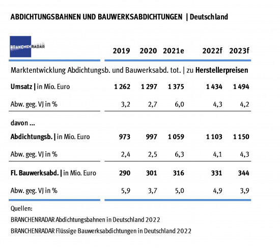 Der deutsche Markt für Abdichtungsbahnen und flüssige Bauwerksabdichtungen wuchs im Jahr 2021 robust. Preiserhöhungen trugen dazu entscheidend bei, zeigen aktuelle Daten einer Studie des Marktforschungsinstituts Branchenradar.com Marktanalyse. Demnach erhöhten sich die Herstellererlöse um sechs Prozent gegenüber Vorjahr auf insgesamt 1,38 Mrd. Euro. Davon entfielen 1,06 Mrd. Euro auf Abdichtungsbahnen und rund 316 Mio. Euro auf flüssige Bauwerksabdichtungen. Angeschoben wurde der Markt laut den Forschern sowohl vom Neubau als auch von verstärkten Baumaßnahmen im Gebäudebestand. Infolge einer zum Teil massiven Verteuerung der Rohstoffe erhöhten die Hersteller zudem die Produktpreise im Durchschnitt um drei Prozent. Daher sei das Umsatzwachstum etwa zur Hälfte preisgetrieben, erklärt das Institut.