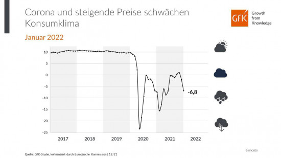 Die Anschaffungsneigung fällt auf den niedrigsten Wert seit Januar 2021. Die Konsumstimmung ist neben der Inflation vor allem durch die pandemiebedingten Einschränkungen beeinträchtigt, wie die Forscher betonen. Die 2G-Regel für weite Teile des stationären Handels verringere die Shopping-Lust und Konsumenten, die weder geimpft noch genesen seien, fielen komplett weg.