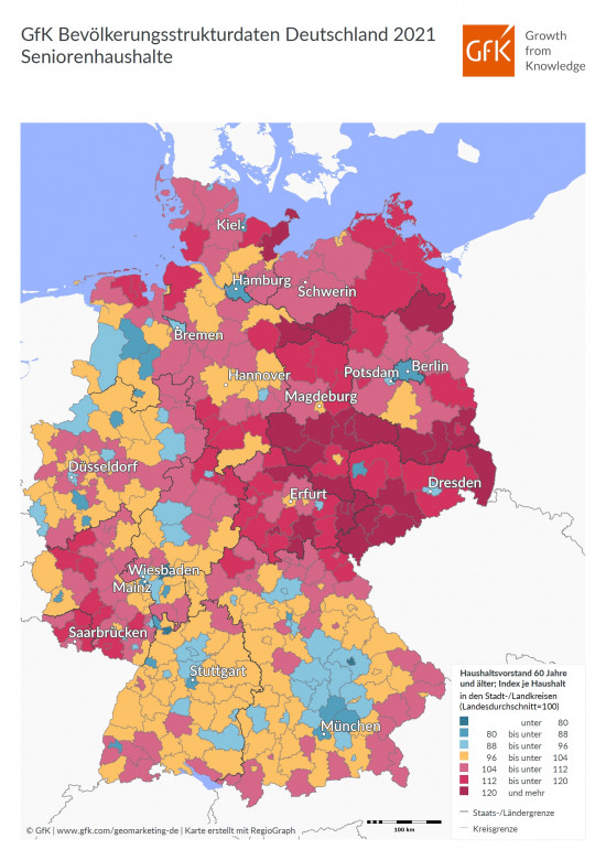 Die meisten Haushalte, in denen der Hauptverdiener 60 Jahre oder älter ist, finden sich eher in ländlichen Gebieten und vor allem im Osten. Der Landkreis Spree-Neiße befindet sich auf Platz neun der Seniorenhaushalte. Den höchsten Anteil gibt es im Stadtkreis Suhl in Thüringen, wo mehr als 48 Prozent aller Haushaltsvorstände über 60 Jahre alt sind. Damit liegt der Kreis fast 32 Prozent über dem Landesdurchschnitt. Mit nur etwas mehr als 27 Prozent gibt es die wenigsten Seniorenhaushalte im Stadtkreis Heidelberg, wo es gleichzeitig auch die meisten jungen Haushalte gibt. Insgesamt weisen 271 aller 401 Kreise in Deutschland einen überdurchschnittlichen Anteil an Seniorenhaushalten auf. Ein überdurchschnittlicher Anteil junger Haushalte findet sich hingegen nur in 114 deutschen Kreisen. Junge Menschen wohnen also regional wesentlich selektiver und geballter.