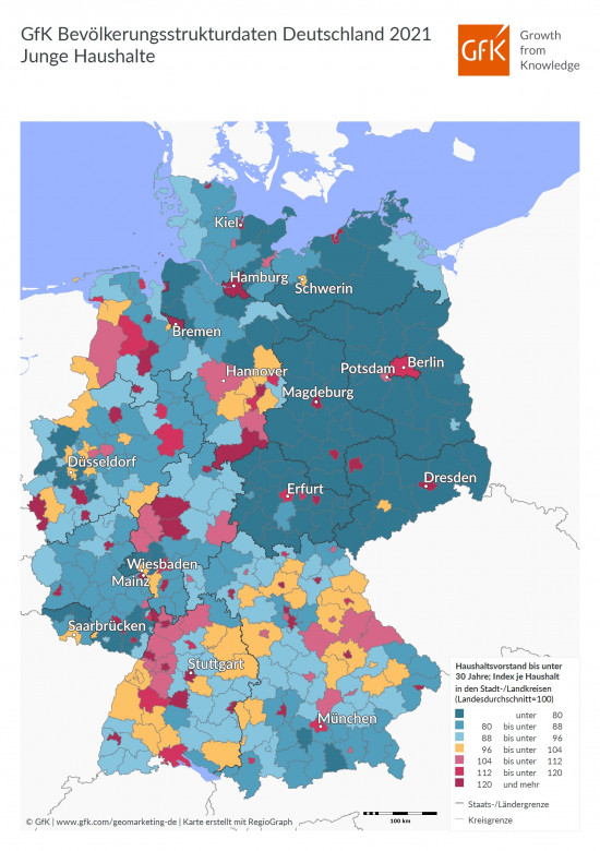 „Die überdurchschnittlichen Werte sind unter anderem auf große Universitäten zurückzuführen. Den letzten Platz belegt, wie auch schon in den Vorjahren, der Landkreis Spree-Neiße, wo nur in etwas mehr als 5 Prozent aller Haushalte der Hauptverdiener unter 30 Jahre alt ist“, berichtet Alexandra Deutsch, GfK-Expertin im Bereich Geomarketing.