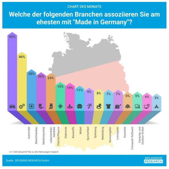 Das Institut untersuchte auch, welche Branchen am meisten mit „Made in Germany“ assoziiert werden. Dabei landete der Bereich Maschinenbau mit einem Anteil von 46 Prozent an zweiter Stelle hinter dem Segment Automobil. Im Mittelfeld befinden sich Anbieter von Elektronikartikeln und Baustoffen mit 15 und 14 Prozent. Im hinteren Bereich des Rankings rangieren Konsumgüter mit einem Anteil von 7 Prozent sowie Camping- und Outdoor-Produkte mit 3 Prozent an letzter Stelle.