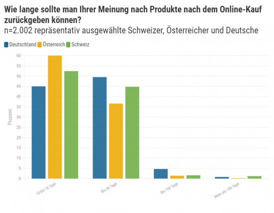 Deutsche lassen sich mit ihren Retouren deutlich mehr Zeit als Österreicher und Schweizer, so ein Ergebnis einer neuen GfK-Studie im Auftrag des Onlinehändlers Galaxus, unter mehr als 2.000 Befragten im DACH-Raum. 49,4 Prozent der Deutschen erwarten vom Onlinehandel bis zu 30 Tage Zeit für eine Retoure. In der Schweiz wünschen sich 44,8 Prozent der Befragten so viel Zeit, in Österreich 36,6 Prozent. 61,8 Prozent der Österreicher sind mit zehn bis 14 Tagen zufrieden.