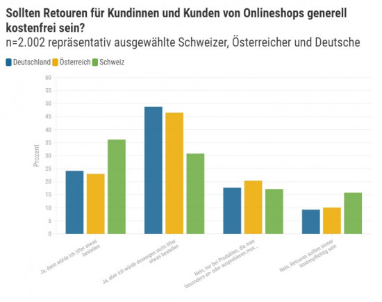73 Prozent der Deutschen und knapp 70 Prozent der Bewohner von Österreich und Schweiz erwarten kostenfreie Retouren. 24 Prozent der Deutschen geben an, öfter zu bestellen, wenn Retouren kostenlos sind. Fast die Hälfte begrüßt kostenfreie Retouren, bestellt aber deswegen nicht mehr. Neun Prozent der Deutschen sagen, dass Retouren grundsätzlich kostenpflichtig sein sollten. In der Schweiz sagen dies knapp 16 Prozent. 36,2 Prozent der Schweizer würden deutlich mehr online bestellen, wenn Retouren kostenfrei wären und gut 20 Prozent der Österreicher und Deutschen. Knapp 40 Prozent der Deutschen würden drei bis sechs Euro für eine Retoure bezahlen. 13 Prozent der Deutschen finden, eine Rücksendung sollte genau so viel Geld kosten, wie sie den Onlinehändler tatsächlich kostet. Das sehen auch 15 Prozent der Österreicher und 19 Prozent der Schweizer so.