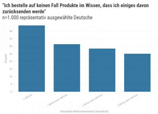 Mehr als ein Drittel der deutschen Onlinekäufer bestellen Ware, ohne diese behalten zu wollen. 28 Prozent der Befragten bestellt „vereinzelt“ bewusst zu viel, 8 Prozent gehen „oft“ so vor. Deutsche, die weniger als 1.000 Euro netto pro Monat verdienen, sagen zu 44 Prozent, dass sie „auf keinen Fall“ Produkte im Wissen bestellen, diese wahrscheinlich wieder zurückzuschicken. Die Befragten aus Haushalten mit 2.000 bis 3.000 Euro Nettoeinkommen sagen nur zu 28,5 Prozent, dass sie auf keinen Fall so vorgehen. Personen mit Einkommen zwischen 3.000 und 4.000 Euro pro Monat sagen dies zu 25,1 Prozent. Die Tendenz zeigt sich nicht in Österreich oder der Schweiz.