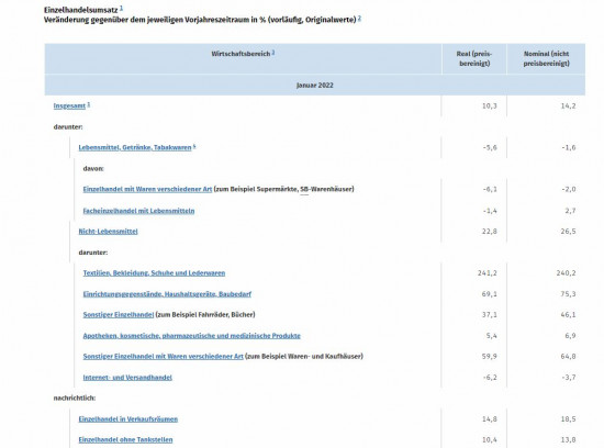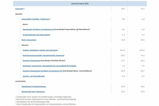 Im Einzelhandel mit Nicht-Lebensmitteln insgesamt stiegen die realen Umsätze im Januar 2022 im Vergleich zum Vormonat um 2,3 Prozent und gegenüber dem Vorjahresmonat um 22,8 Prozent, was laut Destatis auf das niedrige Umsatzniveau im Januar 2021 zurückzuführen ist.