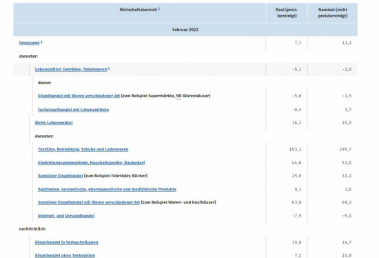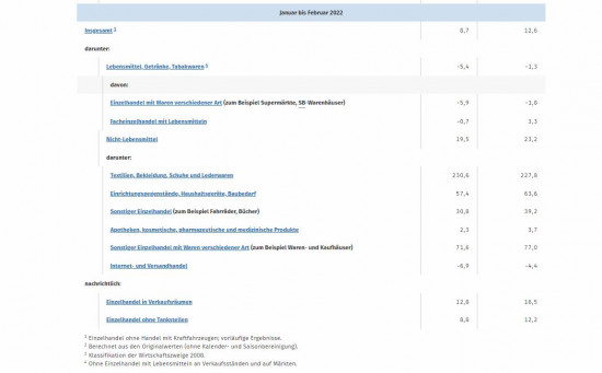 Die deutschen Einzelhandelsunternehmen insgesamt haben kalender- und saisonbereinigt real 0,3 Prozent und nominal (nicht preisbereinigt) 0,6 Prozent mehr umgesetzt als im Januar 2022. Nach dem Umsatzrückgang im Dezember 2021 konnte sich der Einzelhandel somit in den ersten Monaten des Jahres 2022 trotz weiterhin geltender 2G-Regeln erholen. Mit einem realen Plus von 7,0 Prozent und einem nominalen Anstieg um 11,0 Prozent lag der Einzelhandelsumsatz im Februar 2022 auch deutlich höher als im Februar 2021. Im Vergleich zum Vorkrisenmonat Februar 2020 lag der Einzelhandelsumsatz im Februar 2022 real, kalender- und saisonbereinigt 4,4 Prozent höher.