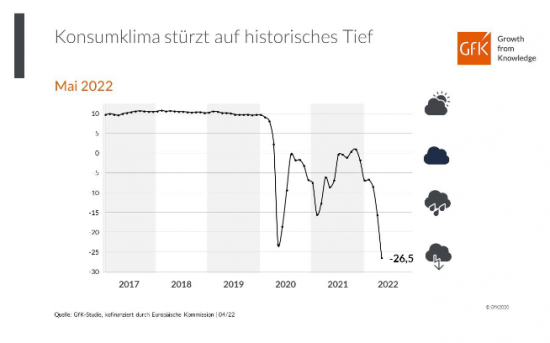 „Der Ukraine-Krieg sowie die hohe Inflation haben der Verbraucherstimmung einen schweren Schlag versetzt. Damit haben sich die Hoffnungen auf eine Erholung als Folge der Lockerungen pandemiebedingter Beschränkungen endgültig zerschlagen,“ erklärt GfK-Konsumexperte Rolf Bürkl.