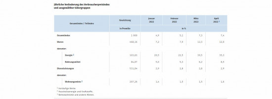 Die Inflationsrate in Deutschland wird laut Angaben des Statistischen Bundesamtes (Destatis) im April 2022 voraussichtlich 7,4 Prozent betragen. Gemessen wird sie als Veränderung des Verbraucherpreisindex (VPI) zum Vorjahresmonat. Im März 2022 hatte die Inflationsrate bei 7,3 Prozent gelegen. Im April 2021 wurde ein Wert von 2,0 Prozent gemeldet. Wie die Wiesbadener nach bisher vorliegenden Ergebnissen weiter mitteilen, steigen die Verbraucherpreise im April 2022 gegenüber März 2022 voraussichtlich um 0,8 Prozent.