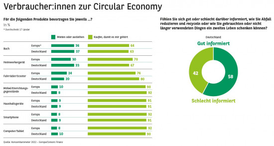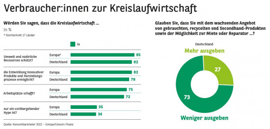 Das Konsumbarometer 2022 „Circular Economy“ des Finanzierungs- und Versicherungsanbieters Consors Finanz zeigt eine Wende hin zum nachhaltigeren Konsum. Bei Baumarkt- und Gartenartikeln bestehe jedoch noch Nachholbedarf. Die Verbraucherstudie wurde im November 2021 online mit Teilnehmern aus 17 Ländern in Europa durchgeführt, darunter Deutschland.