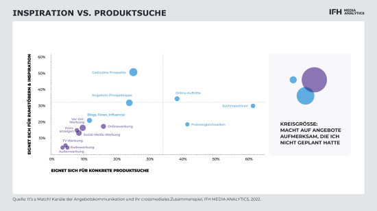 Während Prospekte (53 Prozent) oder Angebots-/Prospektapps (34 Prozent) eher zur Inspiration dienen, eignen sich Suchmaschinen (62 Prozent) und Preisvergleichsseiten (42 Prozent) zur konkreten Angebotssuche. Onlineauftritte bedienen dagegen beides (Inspiration 36 Prozent, Produktsuche 39 Prozent). Primär passiv wahrgenommene Kanäle wie Online- oder Social-Media-Werbung können dagegen auf nicht geplante Angebote aufmerksam machen und so zum Spontankauf animieren.