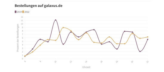 2019 wurden 15 von 100 Einkäufen zwischen 20 und 23 Uhr getätigt. 2020 waren es 17 von 100 und 2021 mehr als 20 Prozent. Jede fünfte Bestellung bei Galaxus erfolgte also nach Feierabend. 2022 ist der Anteil mit mehr als 19 von 100 Bestellungen höher als vor Corona. Während 2019 und 2020 der Tageshöchstwert der Bestellungen noch am Vormittag um 10 oder 11 Uhr gemessen wurde, lag er 2021 erstmals in der Stunde zwischen 20 und 21 Uhr (8,88 Prozent aller Bestellungen am Tag).