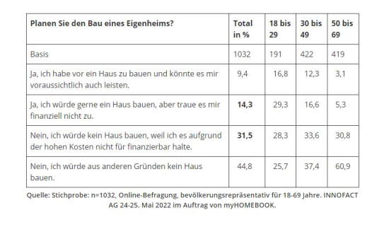 45,8 Prozent der Befragten wollen oder können aufgrund der aktuellen monetären Lage nicht bauen. Von dieser Personengruppe würden 14,3 Prozent gern ein eigenes Haus bauen, 31,5 Prozent denken aufgrund der Kosten gar nicht erst darüber nach. Vor allem die 18 bis 29-Jährigen hegen den Wunsch nach einem Eigenheim. Unter den 50 bis 69 Jahre alten Teilnehmern wünschen das 60,9 Prozent.