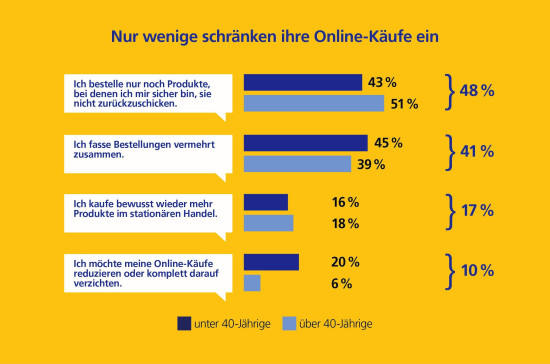 Aus ökologischen Gründen die eigenen Online-Käufe zurückzufahren oder ganz darauf zu verzichten, versuchen aktuell zehn Prozent der Befragten. 27 Prozent der Internet-Käufer bestellen Waren, von denen sie wissen, dass sie diese zurückschicken werden. Jeder Siebte macht sich laut eigenen Angaben beim Einkauf im Netz keine Gedanken über ökologische Aspekte. Vier von zehn Deutschen geben an, bei einer Online-Bestellung darauf zu achten, die Produkte in einer Lieferung zu erhalten.