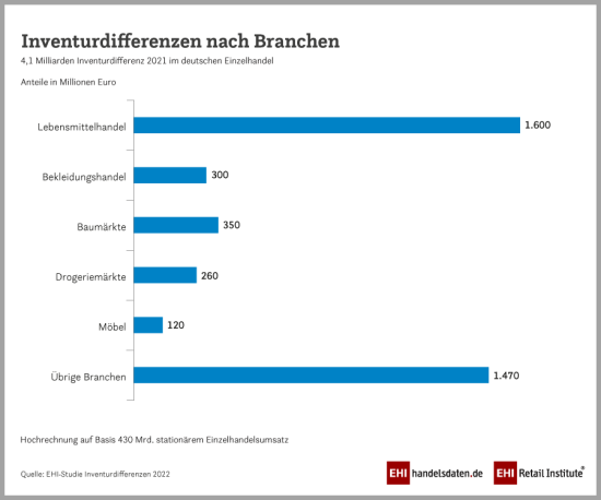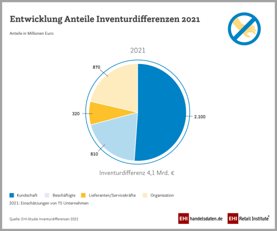 Um seine Waren vor Diebstahl zu schützen, hält der Handel seine Ausgaben bei knapp 0,30 Prozent des Umsatzes auch 2022 konstant. Rund 1,3 Mrd. Euro wurden in Präventionsmaßnahmen wie Artikelsicherung, Kameraüberwachung oder Detektiveinsätze gesteckt. Insgesamt betragen die Kosten für Inventurdifferenzen und deren Vermeidung 5,4 Mrd. Euro.