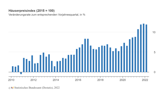 Die Preise für Wohnimmobilien (Häuserpreisindex) in Deutschland sind laut einem Bericht des Statistischen Bundesamtes im ersten Quartal 2022 um durchschnittlich 12 Prozent gegenüber dem Vorjahresquartal gestiegen. Damit lag die Steigerungsrate gegenüber dem Vorjahresquartal zum vierten Mal in Folge über 10 Prozent. Wie die Wiesbadener weiter mitteilen, haben sich Wohnungen sowie Ein- und Zweifamilienhäuser gegenüber dem Vorquartal im Schnitt um 0,8 Prozent verteuert. Damit deute sich eine leichte Abschwächung der Dynamik an, so die Behörde: Im dritten Quartal 2021 waren die Preise für Wohnimmobilien noch um 4,1 Prozent und im vierten Quartal 2021 um 3,1 Prozent gegenüber dem jeweiligen Vorquartal gestiegen.