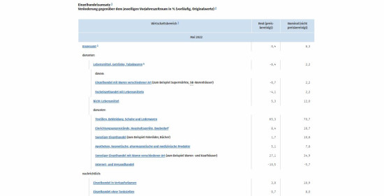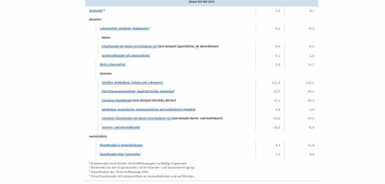 Im Vergleich zum April 2022 setzten die Einzelhändler im Berichtsmonat kalender- und saisonbereinigt real 0,6 Prozent und nominal 2,0 Prozent mehr um. Der Einzelhandel mit Nicht-Lebensmitteln erreichte gegenüber dem Vormonat einen realen Umsatzzuwachs von 2,9 Prozent.