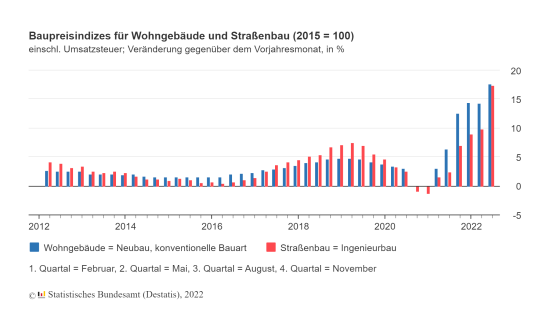 Die Preise für den Neubau konventionell gefertigter Wohngebäude in Deutschland sind nach Angaben des Statistischen Bundesamtes im Mai 2022 um 17,6 Prozent gegenüber Mai 2021 gestiegen. Dies ist der höchste Anstieg der Baupreise gegenüber einem Vorjahr seit Mai 1970 (+18,9 Prozent gegenüber Mai 1969). Im Februar 2022, dem vorherigen Berichtsmonat der Statistik, waren die Preise im Vorjahresvergleich um 14,3 Prozent gestiegen. Im Vergleich zum Februar 2022 erhöhten sich die Baupreise im Mai 2022 um 6,6 Prozent.
