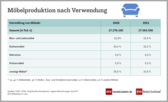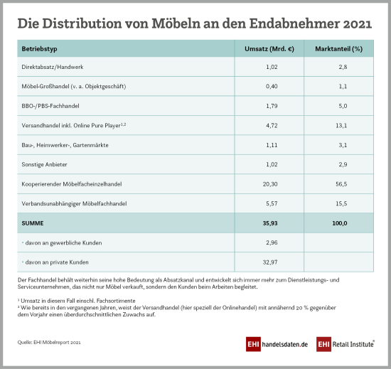 Der deutsche Möbelhandel ist 2021 laut Zahlen des EHI Retail Institute leicht gewachsen. Der Umsatz mit Möbeln betrug demnach insgesamt 35,93 Mrd. Euro, ein Plus von rund 570 Mio. Euro oder 1,6 Prozent im Vergleich zum Vorjahr, als der Umsatz bei 35,36 Mrd. Euro lag. Vom Gesamtumsatz 2021 gingen 72 Prozent (25,87 Mrd. Euro) laut dem EHI auf den stationären Möbelfachhandel zurück.