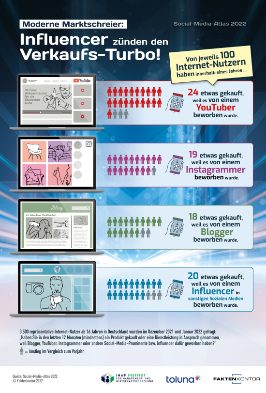 Der Einfluss von Influencern auf Kaufentscheidungen steigt auf ein neues Rekordhoch. Das zeigt der Social-Media-Atlas 2022 der Hamburger Kommunikationsberatung Faktenkontor, für den der Marktforscher Toluna 3.500 Internet-Nutzer ab 16 Jahren repräsentativ befragt hat: Innerhalb von zwölf Monaten haben 24 Prozent der deutschen Onliner Produkte gekauft oder Dienstleistungen in Anspruch genommen, die von einem Youtuber beworben wurden. In der Vorjahresausgabe der Studienreihe, die seit 2011 die Nutzung Sozialer Medien in Deutschland beleuchtet, lag die Quote noch bei 21 Prozent.