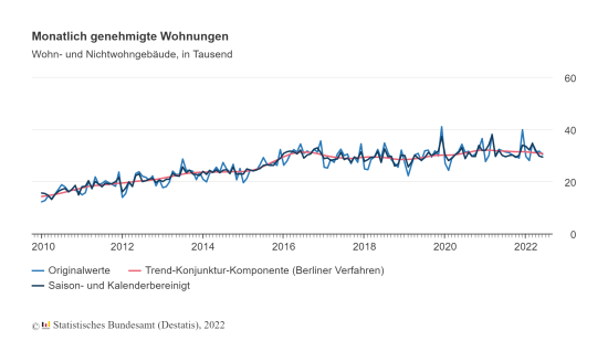 Im Juni 2022 ging laut dem Statistischen Bundesamt (Destatis) die Zahl der Baugenehmigungen für Einfamilienhäuser in Deutschland im Vergleich zum Vorjahresmonat um 17,0 Prozent (8.583) auf 41.765 zurück. Bei den Zweifamilienhäusern stieg die Zahl genehmigter Wohnungen um 1,6 Prozent (254) auf 16.622 und bei den Mehrfamilienhäusern um 7,8 Prozent (7.179) auf 99.755.