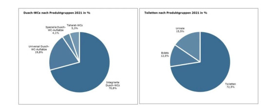 Bei den Toiletten erreichen die gewöhnlichen Toiletten mit einem Marktanteil von 72,5 Prozent die Spitzenposition. Urinale kommen auf 15,5 Prozent Marktanteil, Bidets folgen mit 12,0 Prozent auf Position drei. Die größte Produktgruppe bei den Dusch-WCs bilden die integrierten Dusch-WCs. Im Durchschnitt kommen sie auf einen Marktanteil von 70,8 Prozent. Dahinter folgen Universal-Dusch-WC-Aufsätze mit 19,8 Prozent und Taharet-WCs, ein besonderer Typ des Dusch-WCs, mit 5,3 Prozent Marktanteil. Spezielle Dusch-WC-Aufsätze kommen auf 4,1 Prozent Marktanteil.