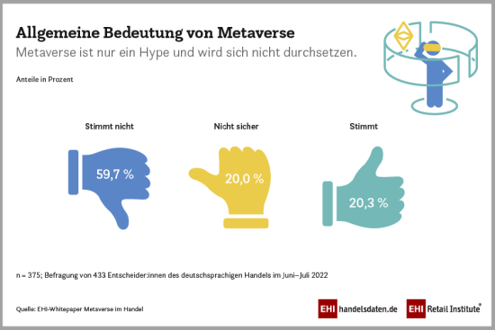 Mehr als drei Viertel der Entscheiderinnen und Entscheider aus dem deutschsprachigen Handel denken, dass das Metaverse ihnen spannende Anwendungsmöglichkeiten bietet. Das hat das EHI in einer Studie im Auftrag des Software-Entwicklers EPAM Systems herausgefunden. Der Begriff ist 78,1 Prozent der Befragten geläufig, 71,5 Prozent erklären, dass das Thema in ihren Unternehmen nicht bekannt ist. 59,7 Prozent nehmen an, dass sich das Metaverse durchsetzen wird. 20,3 Prozent halten es nur für einen Hype, der Rest ist sich unsicher. 40,8 Prozent glauben, dass Metaverse den Handel für immer verändern wird, 34,9 Prozent verneinen dies.