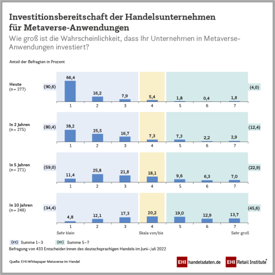 Aktuell halten vier Prozent der Umfrageteilnehmer Investitionen ihres Unternehmens in Metaverse-Anwendungen für wahrscheinlich. Jedes vierte Handelsunternehmen plant, in den kommenden fünf Jahren in diese Technologien zu investieren, in zehn Jahren hat dies fast jeder zweite Händler vor. Dabei glauben 4,9 Prozent, dass ihr Unternehmen die notwendige Expertise hat, um ins Metaverse-Geschäft einzusteigen; über die Hälfte hat bisher gar kein Personal mit entsprechender Expertise.