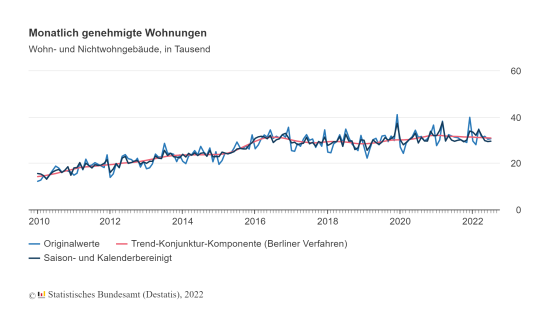 Nimmt man die Baugenehmigungen für Wohnungen in bestehenden Gebäuden hinzu, wurde im Berichtsmonat der Bau von 30.653 Wohnungen genehmigt. Das waren 2,2 Prozent oder 681 Baugenehmigungen weniger als im Juli 2021. Von Januar bis Juli 2022 wurden damit insgesamt 216.425 Baugenehmigungen für Wohnungen erteilt – dies waren 2,1 Prozent oder 4.690 weniger als im Vorjahreszeitraum (Januar bis Juli 2021: 221.115).