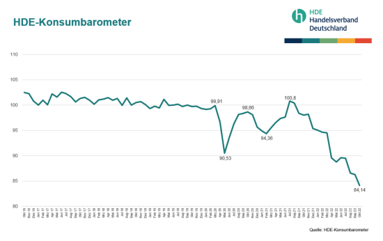 Der Negativtrend bei der Verbraucherstimmung hält im Oktober an. Das Konsumbarometer des Handelsverbandes Deutschland (HDE) geht den dritten Monat in Folge zurück und erreicht erneut ein Allzeittief. Es sei zu erwarten, dass sich der Pessimismus der Verbraucherinnen und Verbraucher in den nächsten Monaten negativ auf den privaten Konsum auswirken wird, so der Verband
