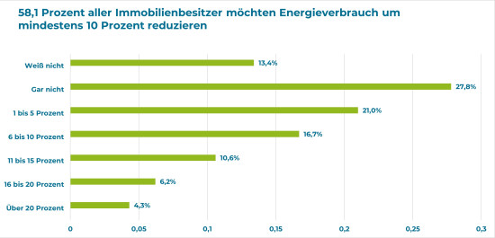 58,1 Prozent aller befragten Eigenheimbesitzer geben an, ihren Energieverbrauch verringern zu wollen. Dabei planen 21,1 Prozent eine Energiekosteneinsparung von 10 Prozent und mehr. 27,8 Prozent der Teilnehmer geben an, den Energieverbrauch ihrer Immobilie nicht senken zu können.