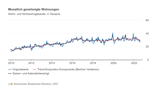 Nimmt man die Baugenehmigungen für Wohnungen in bestehenden Gebäuden hinzu, wurde im August 2022 in Deutschland der Bau von 28.180 Wohnungen genehmigt. Das waren 9,4 Prozent oder 2.934 Baugenehmigungen weniger als im August 2021. Von Januar bis August 2022 wurden 244.605 Baugenehmigungen für Wohnungen erteilt – das waren 3,0 Prozent oder 7.624 weniger als im Vorjahreszeitraum (Januar bis August 2021: 252.229).