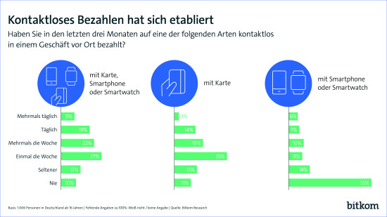 Für die Mehrheit der Bundesbürgerinnen und Bundesbürger gehört das Bezahlen mittels Karte, Smartphone oder Smartwatch laut einer Bitkom-Befragung inzwischen zum Alltag. Demnach haben von Juli bis September dieses Jahres 90 Prozent mindestens einmal auf diese Weise im Laden an der Kasse bezahlt, 50 Prozent der Befragten nutzen diese Möglichkeit mehrmals die Woche. 9 Prozent bezahlen mehrmals täglich kontaktlos, 19 Prozent täglich und 22 Prozent mehrmals die Woche. 27 Prozent bezahlen mindestens einmal in der Woche kontaktlos, 13 Prozent seltener.