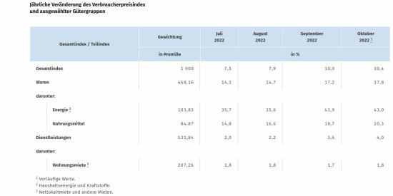 Die Inflationsrate in Deutschland wird laut bisher vorliegenden Ergebnissen des Statistischen Bundesamtes im Oktober 2022 voraussichtlich 10,4 Prozent betragen. Im Vormonat hatte sie bei 10,0 Prozent gelegen. Die Verbraucherpreise steigen gegenüber September 2022 voraussichtlich um 0,9 Prozent.