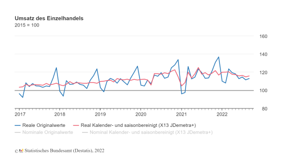Die Einzelhandelsunternehmen in Deutschland haben im September 2022 nach vorläufigen Ergebnissen des Statistischen Bundesamtes kalender- und saisonbereinigt real (preisbereinigt) 0,9 Prozent und nominal (nicht preisbereinigt) 1,8 Prozent mehr umgesetzt als im August 2022. Im Vergleich zum September 2021 verzeichnete der Einzelhandel im Berichtsmonat ein Umsatzminus von real 0,9 Prozent und nominal ein Umsatzplus von 9,9 Prozent. Die Differenz zwischen den nominalen und realen Ergebnissen spiegele die hohen Preissteigerungen im Einzelhandel wider, so die Statistiker. Im Vergleich zum Jahres-Höchstwert im März 2022 ging der Einzelhandelsumsatz um 3,8 Prozent zurück, lag jedoch um 3,2 Prozent höher als im September des Vor-Corona-Jahres 2019.