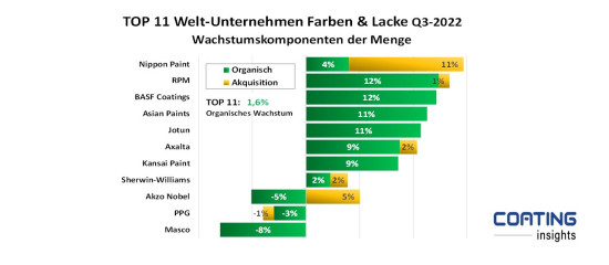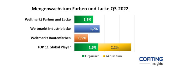 Der Weltmarkt für Farben und Lacke wuchs im dritten Quartal 2022 nach Einschätzung von Coating Insights volumenbezogen um 1,3 Prozent. Die Top 11 Global Player, zu denen unter anderem PPG, Sherwin-Williams und Akzo Nobel gehören, legten mengenmäßig um 3,8 Prozent zu. Das Wachstum der Top 11 gliedert sich in organisches Wachstum (+1,6 Prozent) und Akquisitionen (+ 2,2 Prozent). Damit konnten diese Anbieter ihren Marktanteil am Weltmarkt weiter ausbauen, so die Forscher.