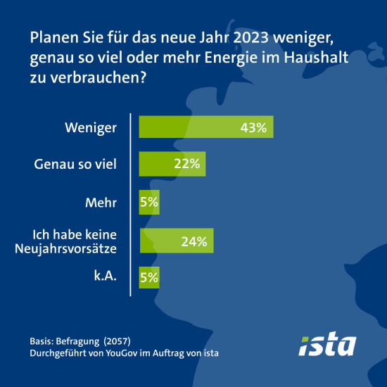 Fast die Hälfte der Deutschen will als Neujahrsvorsatz weniger Energie im Haushalt verbrauchen. Das gaben 43 Prozent der Befragten bei einer Studie an, die das Markt- und Meinungsforschungsinstitut Yougov Mitte Dezember im Auftrag des Energiedienstleisters Ista durchgeführt hat. 32 Prozent haben es sich demnach zum Ziel gesetzt, etwas weniger Energie zu verbrauchen und 11 Prozent sogar viel weniger.
