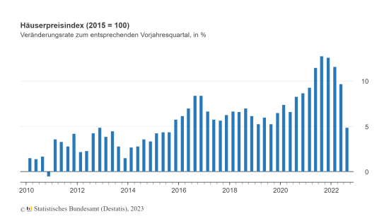 Die Preise für Wohnimmobilien (Häuserpreisindex) in Deutschland sind laut Zahlen des Statistischen Bundesamtes im dritten Quartal 2022 um durchschnittlich 4,9 Prozent gegenüber dem Vorjahresquartal gestiegen. Damit hat sich die Veränderungsrate des Häuserpreisindex gegenüber dem Vorjahresquartal im Vergleich zum zweiten Quartal 2022 nahezu halbiert (+9,7 Prozent gegenüber dem zweiten Quartal 2021). Eine niedrigere Veränderungsrate gegenüber dem Vorjahresquartal wurde zuletzt im dritten Quartal 2015 verzeichnet (+4,4 Prozent). Wohnungen sowie Ein- und Zweifamilienhäuser waren im Vergleich zum Vorquartal im Schnitt um 0,4 Prozent günstiger.